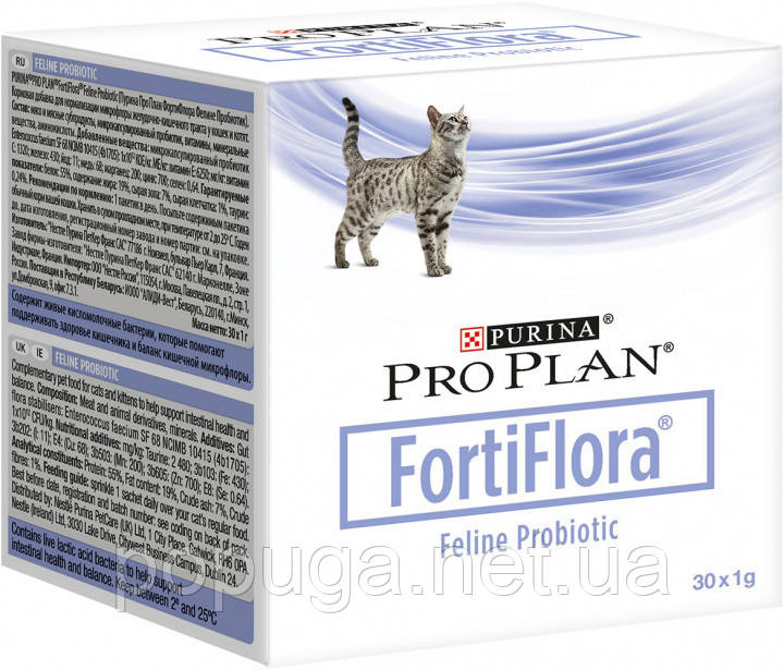 Додатковий корм Purina Pro Plan FortiFlora Feline Probiotic не забезпечує добову потребу тварин у поживних речовинах і повинен споживатися в поєднанні з повнораціонним і збалансованим кормом. Додатковий корм, сприяє підтримці мікрофлори шлунково-кишкового тракту дорослих кішок і кошенят. Містить живі молочнокислі бактерії, які допомагають підтримувати здоров'я кишечника і баланс мікрофлори.